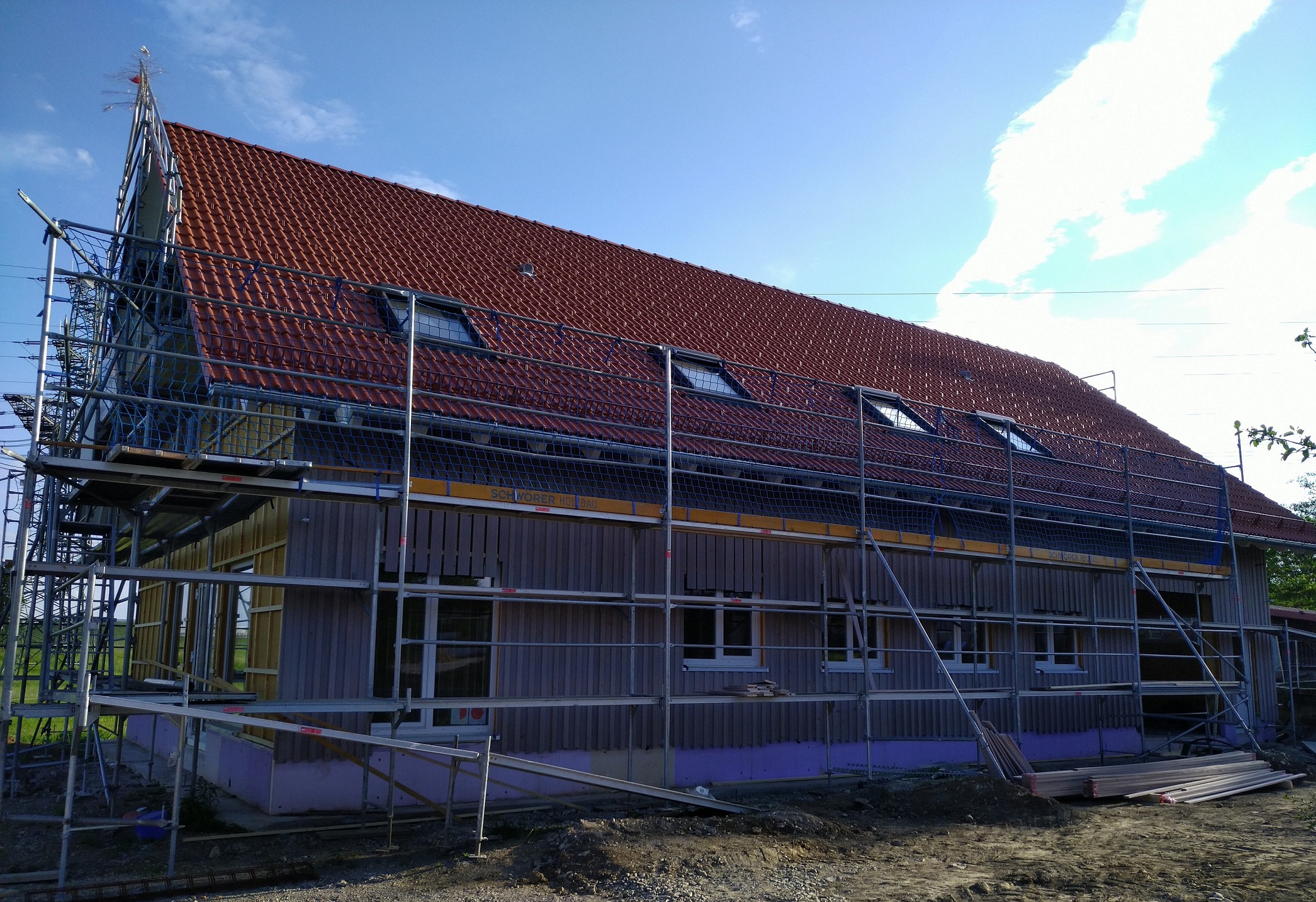 In Donaueschingen am Ziegelhof entsteht eine neue Backstube komplett in Holzbauweise. Die Außenwände wurden in Holzrahmenbauweise erstellt, die Wärmedämmung erfolgte mit Zellulose–Einblasdämmung. Die Massivholzdecken in Sichtqualität wurden aus Brettsperrholz gefertigt. Aktuell wird die Fassade fertiggestellt. Hier kommt eine sägeraue, vorvergraute Deckleistenschalung zum Einsatz. Die hochwertigen „Dura-Patina“ Produkte stellen ein gleichmäßiges Ergebnis sicher, das den natürlichen Vergrauungseffekt der Fassade vorwegnimmt.